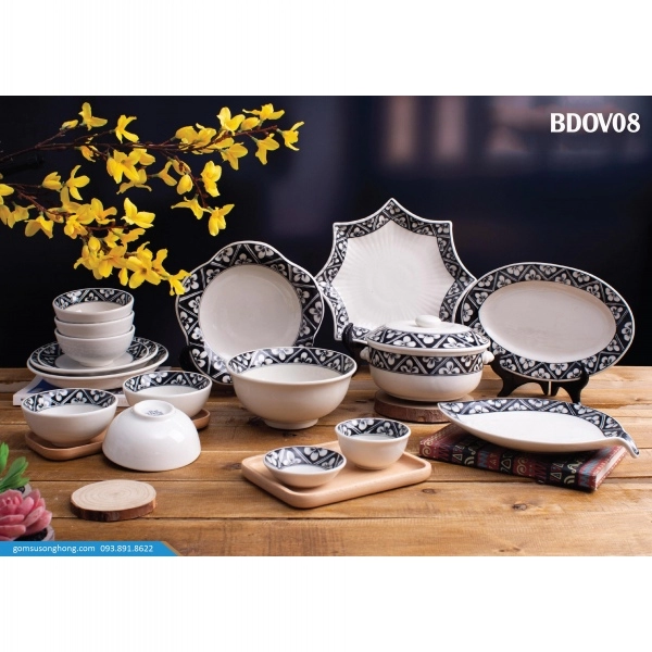 Bát Đĩa Vẽ Tay Viền Cánh Đào - BD0V08