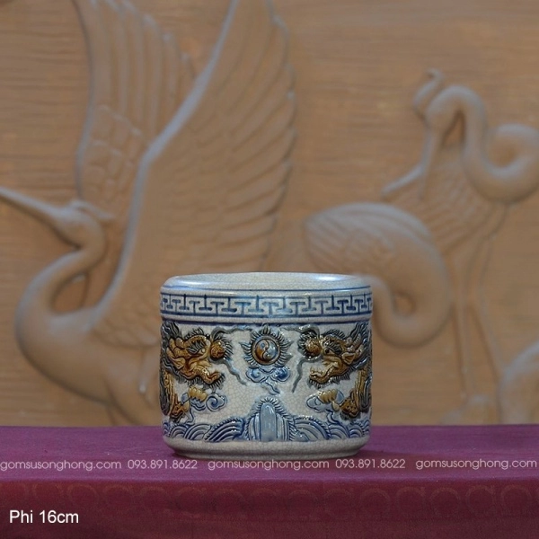 Bát Hương Men Rạn 16cm Đắp Nổi Song Long Chầu Nguyệt
