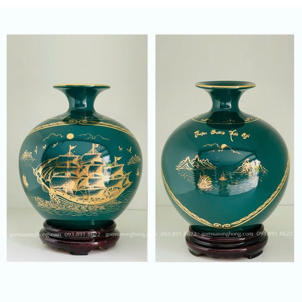 Bình Gốm Hút Lộc Xanh Lục Ngọc Bảo Thuận Buồm Xuôi Gió Vẽ Vàng Kim - Mẫu 12