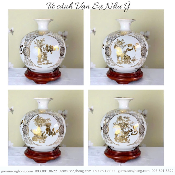 Bình Hút Lộc Sứ Trắng Vẽ Vàng Kim Vạn Sự Như Ý - Mẫu 3