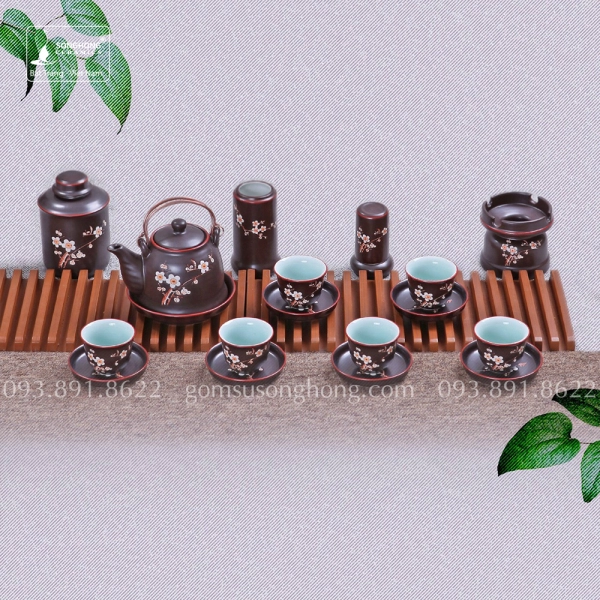 Bộ Trà (Ấm Chén) Khắc Tay Men Nâu Hoa Đào 300ml Kèm Phụ Kiện - Mẫu 4
