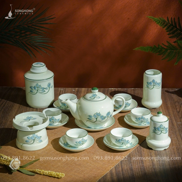 Bộ Trà (Ấm Chén) Kèm Phụ Kiện Vẽ Sen Xanh 350ml - Mẫu 1