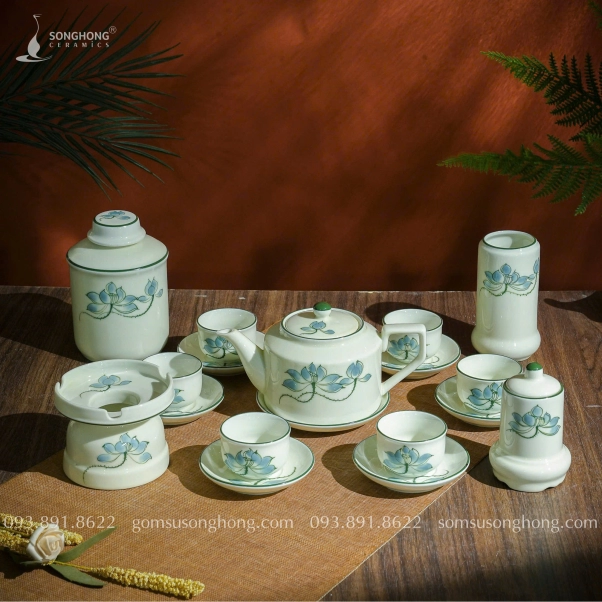Bộ Trà (Ấm Chén) Kèm Phụ Kiện Vẽ Sen Xanh 500ml - Mẫu 5