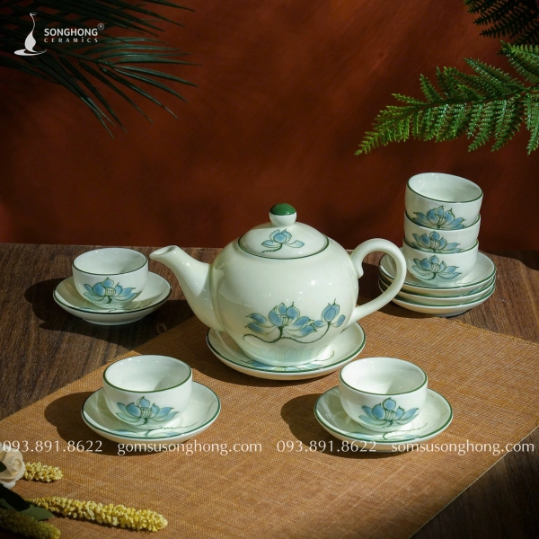 Bộ Trà (Ấm Chén) Vẽ Sen Xanh 350ml - Mẫu 1