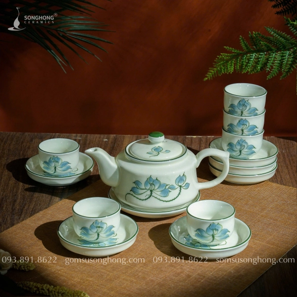 Bộ Trà (Ấm Chén) Vẽ Sen Xanh 450ml - Mẫu 3