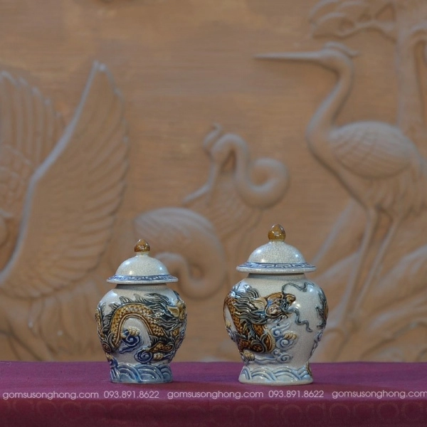 Thành phần: đất trắng ngà, đắp nổi & vẽ tay thủ công, tráng men rạn cổ truyền thống.