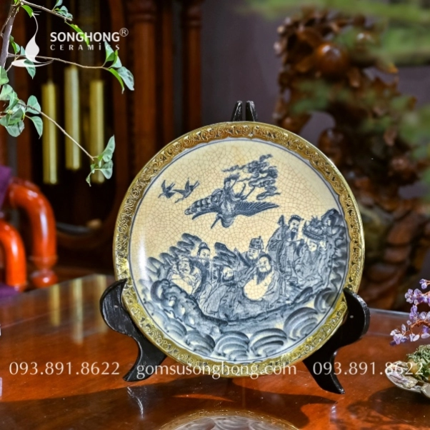 Tranh Đĩa gốm sứ men rạn bọc đồng cao cấp vẽ tích Trúc Lâm Thất Hiền