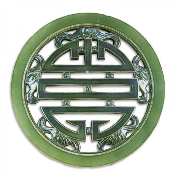 Gạch thông gió chữ Thọ tròn bằng chất liệu sứ tráng men màu xanh. Gạch chữ Thọ tròn có kích thước Ø600 mm, độ dày 50 mm và khối lượng là 11kg/viên.