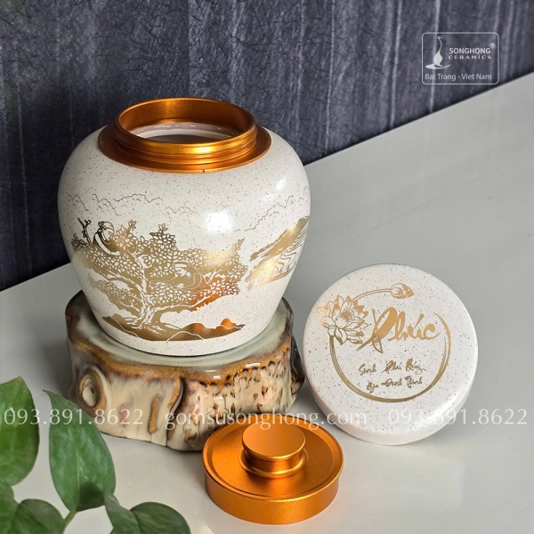Nắp: Bên trong là nắp ren xoáy 2 lớp kết hợp nắp ren gốm bên ngoài đảm bảo độ kín của hũ trong việc bảo quản trà và giúp tổng thể sản phẩm nhìn hài hòa hơn.