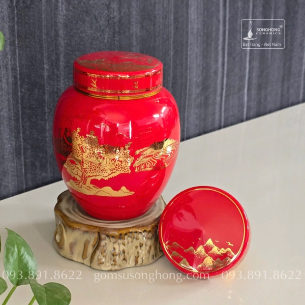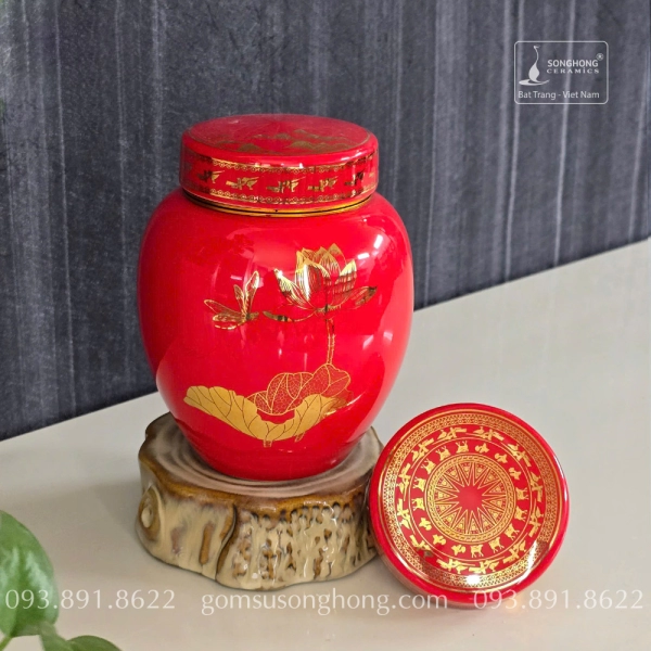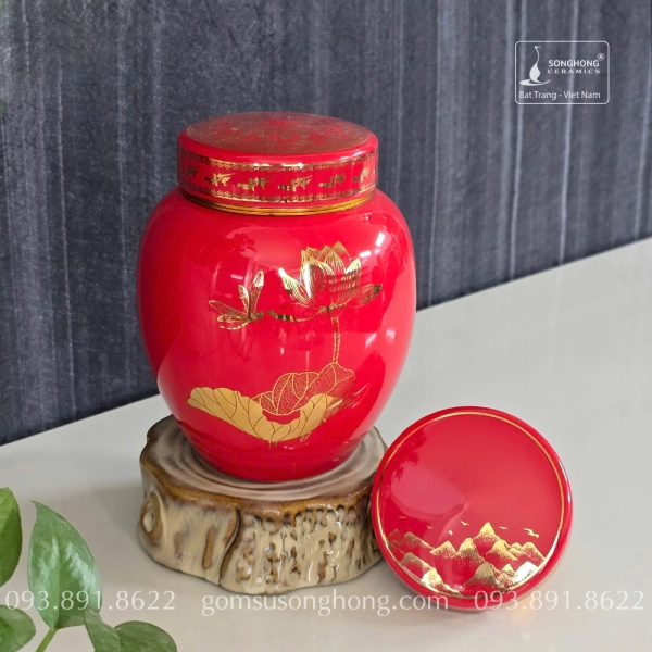 Hũ Sứ Đựng Trà 480ml Màu Đỏ Hoa Sen Chuồn