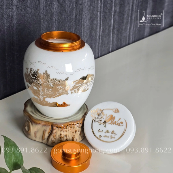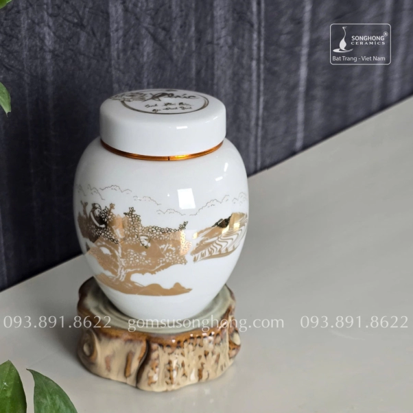 Thành phần: Đất sét trắng, men màu, họa tiết trang trí bằng vàng kim, nắp hợp kim mạ vàng đảm bảo kín khít, nắp gốm sứ bên ngoài.