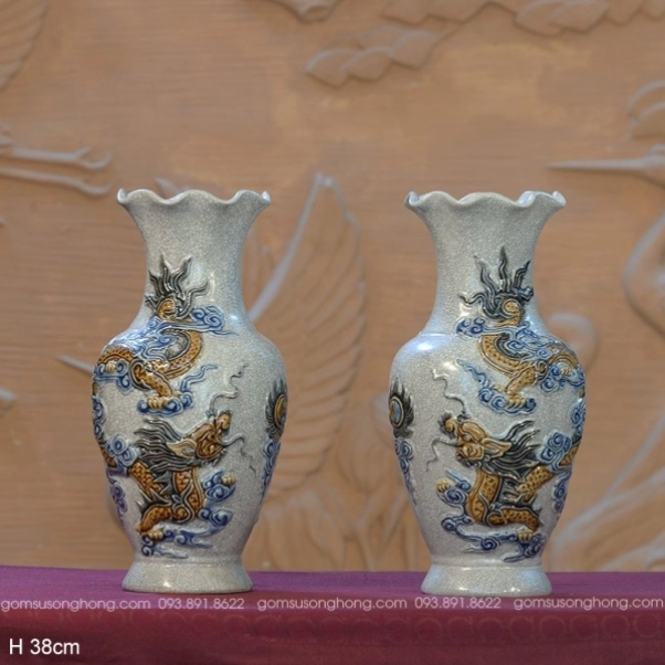 Lọ Miệng Lượn H38cm Men Rạn Đắp Nổi Song Long Chầu Nguyệt